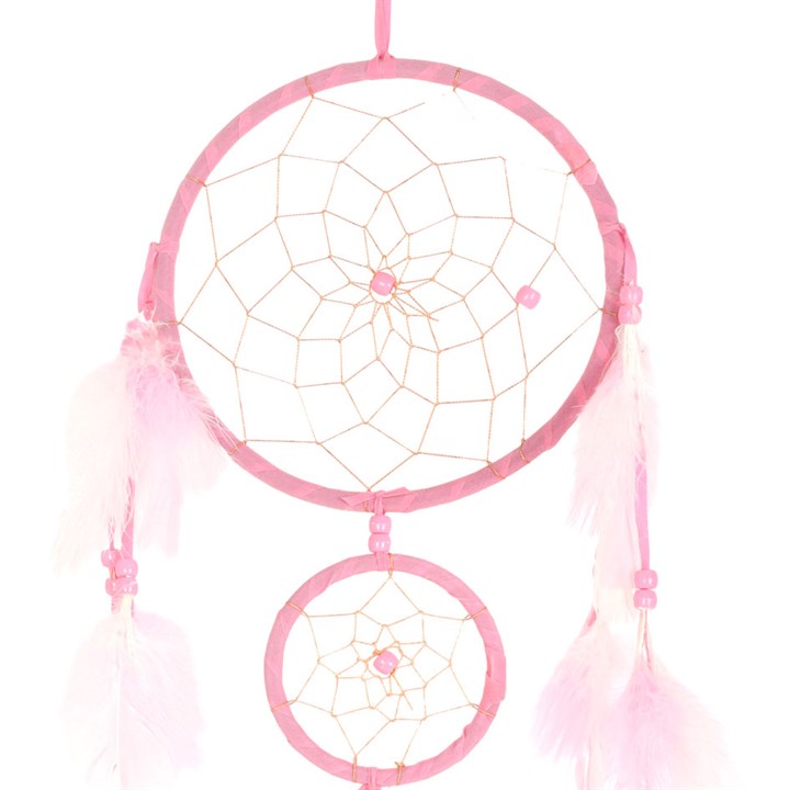 This vibrant dreamcatcher features 2 light pink hoops and webs dotted with pink beads. Feather tassels finish off this fun and playful style and is sure to add a pop of colour to your decor. Approximately 80cm total length.